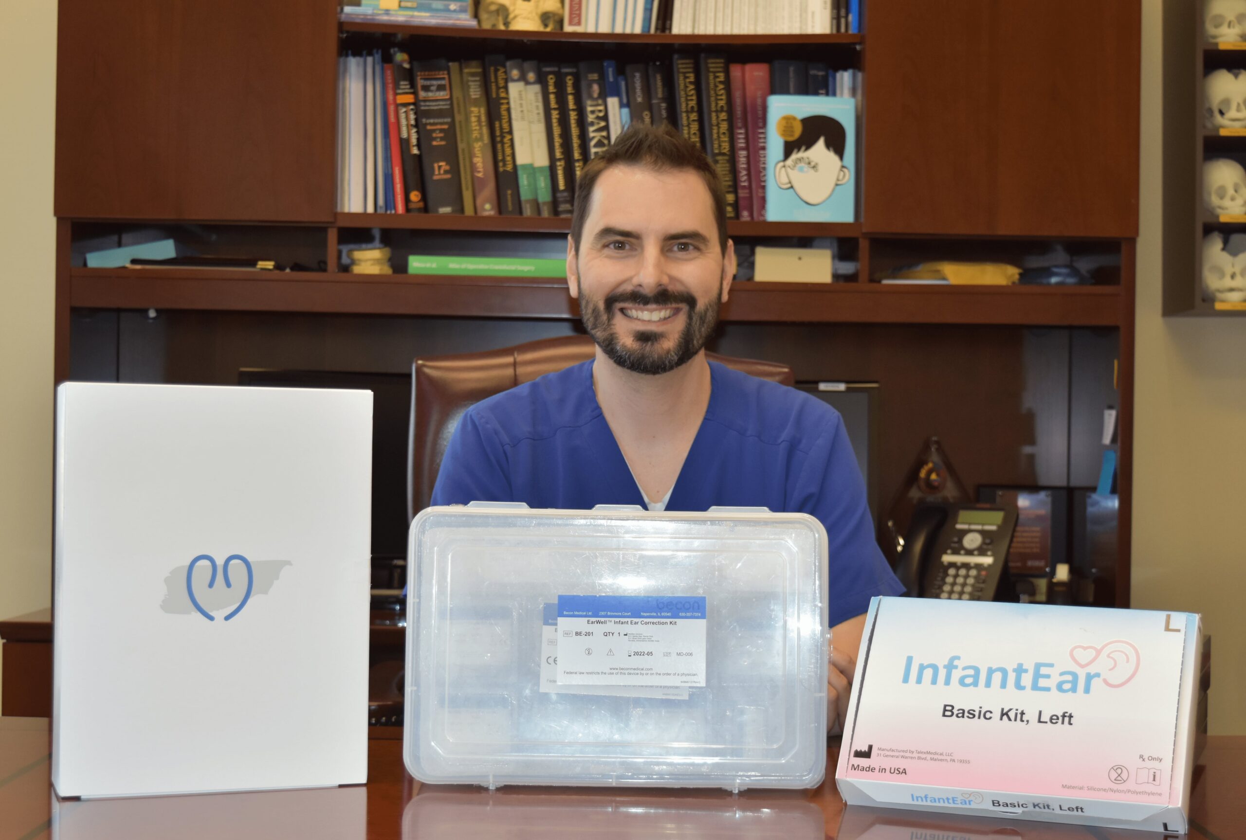 - EarWell™: The EarWell™ molding kit is the system Dr. Payne utilizes most frequently at his Houston practice, as well as the device he has been using the longest. EarWell™ is designed to foster growth of a normal ear shape using four pieces that cover the entire ear. Each kit comes in either a medium or large size to better conform the device to your newborn’s ear, and all the pieces are secured with an ear molding putty and special skin adhesive. While EarWell™ can be a relatively more complex system to use when compared to other systems, Dr. Payne has found that the all-encompassing kit includes all the pieces he may possibly need, and the quality of results achieved have been superior. He was personally trained to use the device by the founder of EarWell™ , Dr. Steve Byrd.