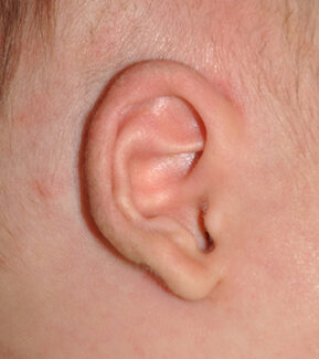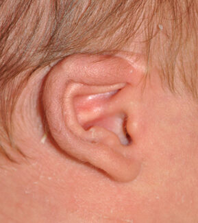 This 2 week old infant displays Lidding Ear Deformity, during their initial visit and after 6 weeks of ear molding treatment with 2 weeks of taping.
