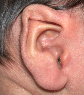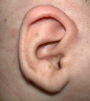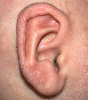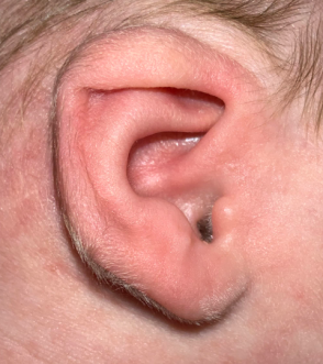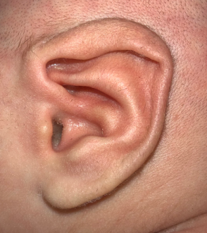 This 2 week old infant displays Lidding Ear Deformity, during their initial visit and after 6 weeks of ear molding treatment with 2 weeks of taping.